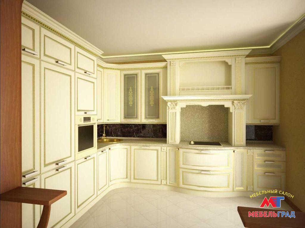 Описание: Кухонная мебель классика подходит для помещений большой площади. Если кухня небольших размеров, то массивные фасады мебели будут ее визуально уменьшать.